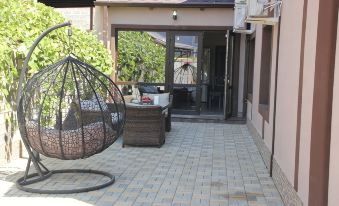 There is a spacious terrace with tables and sun beds on the territory.