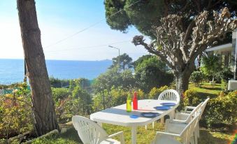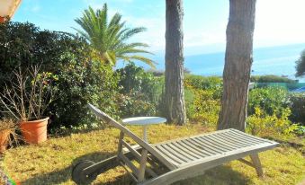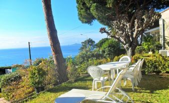 A large terrace overlooking a private garden with stunning views of the Gulf of Ajaccio and the sanguinary Islands.