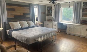 The second story of the home has a split staircase with 2 bedrooms and one full bath on each side of the house. While you can see from one side to the other, the split stairway creates nice separation if you are traveling with two families. Several of the bedrooms have headboards with a built in charging station. The fifth bedroom is a private den on the first floor, with a pull out couch, doors that close for privacy, and a full bath attached where you may enjoy a soak in the clawfoot tub! There is a toddler bed and Pack n' Play available upon request.