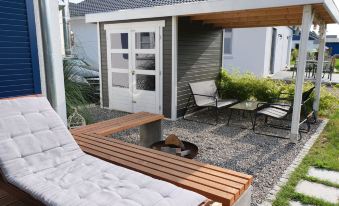 There are a total of 3 parking spaces (2 directly at the house) and a private garden with a spacious terrace. with dining table for six people and a large parasol. The 3 sun loungers make you forget the world around you and pushchairs or bicycles fit into the garden shed. We have a great barbecue and fire place and a covered lounge for you!