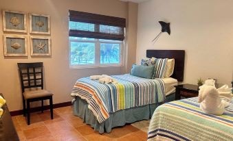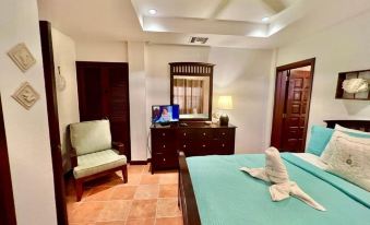 On the second floor of the building; this unit is fully equipped with stainless steel appliances, Belizean Hardwood Cabinets, central air-conditioning, washer and dryer. There is a master bedroom with queen sized bed, Cable TV and an en-suite bathroom and a second bedroom with 2 twin beds that can be converted into a king bed upon request. The second bathroom is in the hallway.