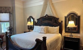Treat yourself to our largest & most luxurious suite! The EBONY ROUGE SUITE is beautifully furnished with a super comfortable KING SIZE bed & the finest linens! Plush rugs adorn the original hardwood floors & art decorates the shiplap wood walls. The bay window has a nice sitting area with a great view & custom made black out drapes! This suite includes a full bath with soaking tub & spray nozzle for old fashioned "sit down" shower. A separate quirky "shower closet" opens up into the bedroom. Although it is unconventional, many guests prefer a stand up shower so we were creative & added one.