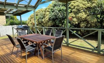 Welcome to Paradise by the Sea. Perfect for a family holiday in beautiful Apollo Bay. 400 mtr walk to the beach, 10 min walk to the heart of town, the magical Otways as your backdrop. House accommodates 6 people comfortably, 2 x Queen size Beds & 2 Single Beds, Ensuite, Main Bathroom, Sep Toilet, Outdoor shower for washing off the sand after a beach outing. Beautiful outdoor covered deck with BBQ, you may even see a Koala in the trees at the rear of the porperty. Linen Provided. You just need to BYO beach towels.