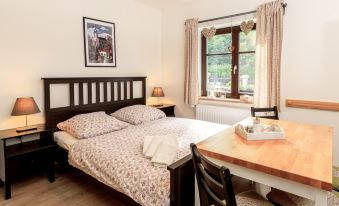 Cosy apartment block detached, built in 2015. On the outskirts, in a quiet, sunny position. For shared use: property. Terrace, garden furniture, fireplace, barbecue house, children's playground. In the complex: playroom, trampoline, storage room for bicycles, central heating system. Parking at the house. Grocery 300 m, shopping centre 9 km, restaurant 100 m, bus stop "Arnoltice" 400 m, railway station "Děčín východ" 10 km, outdoor swimming pool 4.5 km, indoor swimming pool 8 km. Golf course (9 hole) 7 km, tennis 7 km, indoor tennis centre 7 km, minigolf 12 km, walking paths from the house 100 m, cycle lane, children's playground 450 m. Nearby attractions: vyhlídka Belveder 4 km, Hřensko 6 km, Pravčická brána 8 km, Děčín - zámek, aquapark, zoo 10 km, Děčínský Sněžník, Bad Schandau, zříceniny hradů Falkenštejn, Šunštejn 20 km, Liberec, Drážďany 70 km. Hiking paths: kaňon Labe, Jetřichovické skály, České Švýcarsko/Böhmische Schweiz. "Arnoltice 2", 1-room apartment on the ground floor. Entrance hall. Living/sleeping room with 1 x 2 bunk beds, 1 double bed and satellite TV. Kitchenette (2 ceramic glass hob hotplates, toaster, kettle, microwave) with dining table. Shower/WC. Facilities: Internet (WiFi, free). Please note: suitable for families apartment street side. Non-smokers only.