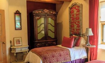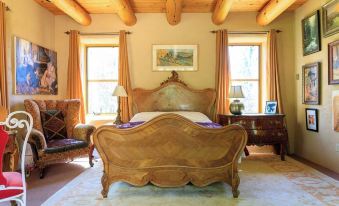 The walls are 18-inch thick adobe with viga and beam ceilings, flagstone floors covered with oriental rugs, and antique furniture throughout. The house feels good, warm, cozy, and luxurious. The furnishings and finishes have been selected with great care and comfort in mind.