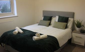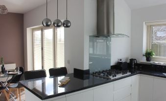Had a great stay here, we were at a wedding at Morley Barn which is literally 5 mins down the road so a great location for us. The house is on a newish development and it was nice and quiet, yet very near to major road networks. It was all superbly clean throughout with very good showers. It was warm - too warm in fact, we turned the heating off!!!! If you want to do some proper cooking for 5-7 people, the kitchen is a touch on the sparse side for cooking stuff, we only had breakfast so didn't matter to us. Can't comment on dishwasher, cooker, washing machine or dryer as we didn't use them. Overall a great place if you're in the area and in need of a few nights stay.