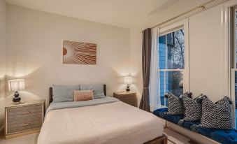 The bedroom has a 9'-1" ceiling, black out shades, and top notch linens for your stay. Spacious with great sunlight throughout the day this is the place to be.