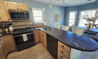 The kitchen has all the appliances and amenities needed to prepare a meal. There is a dining table to seat up to 6, and counter bar stools for additional seating.