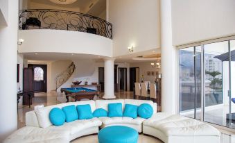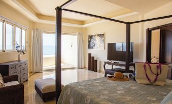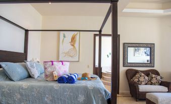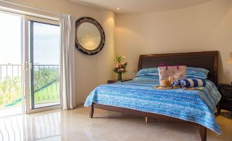 The large spiral staircase transports you to the grand master bedroom on the second floor. It includes a California King Canopy bed, sitting area, HD TV with Sky Cable, balcony with ocean views, and a large private master bathroom complete with shower, jacuzzi with ocean views, a large steam sauna and spacious closet.