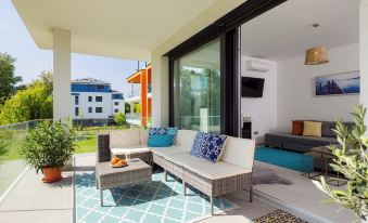 The modern, elegantly designed apartment features two spacious bedrooms, a full equipped kichten, a spacious living room and a really large terrace with stunning sunset views.