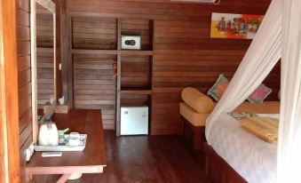 We felt at home as soon as we stepped in. The owners are so kind and welcoming. The room are différent isolated wooden chalet surrounded , with exotic flowers. All have à direct or semi direct view with the pool. You hear the forest sounds but from the confort of large bed equiped with a mosquito net . Loooved it !