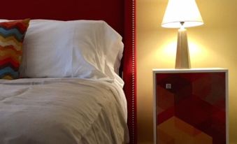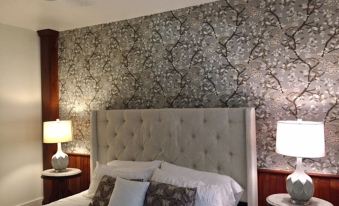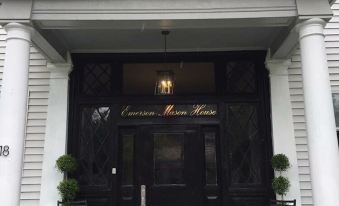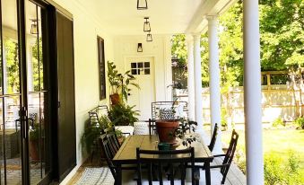 The design of the Emerson House is inspired by elements that were an essential part of the original building, such as the wood beadboard wainscot and cabinets and the high ceiling with beams and heavy trim work. The decor is inspired by a large set of vintage "Blue Willow" china that was left behind, reflected in the kitchen's color scheme, modern fabrics that harken to the same feeling, and an array of china as wall decoration. Furnishings include a mix of antiques and new furniture. Once stripped of all of the lateral windows, new windows have been installed, including a 16-foot long four-panel door in the living room, leading to a covered deck and a good-sized fenced yard. Once possessing a catering kitchen, it still has a 10-burner, two commercial oven ranges, plus a plethora of new appliances. A large dining area, with a wide sideboard and a bar, includes a 12-foot-long table (an original to the building). All wiring and lighting have been updated, and the main space is air-conditioned.