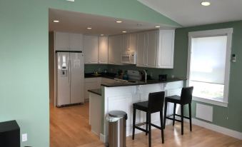After an exciting day of exploring, return to the newly renovated, upscale second floor condo which has two bedrooms with queen beds and two full bathrooms with tub/showers. The home is nicely decorated and has beautiful artwork throughout. The modern kitchen is well equipped and has all you need to make your own meals at home. Also included is a laundry room, Wifi, Smart and Cable TV, and Smart Lock. And on those rare days when it gets hot in Bar Harbor, the apartment is completely air conditioned!