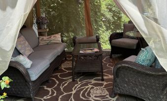 Outside, the cottage offers a large yard surrounded by a white picket fence ....as well as a private screened gazebo for guests .and a separate patio seating area with a table and chairs for relaxing and enjoying the flowers .