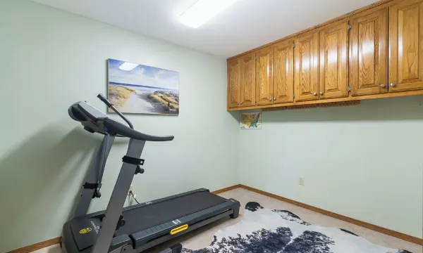 Walkout lower level with smart TV, gym, kitchenette, two bedrooms, and a remodeled bathroom.