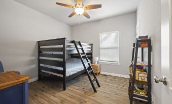 BEDROOM 3: bunk beds with two full-sized beds, dresser, reading chair, and bookshelf with children’s books and toys. Large closet has suitcase stand, hangers, and extra sheets and blankets