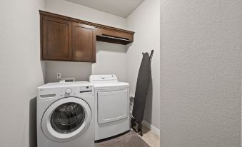 LAUNDRY ROOM: brand new full-sized LG washer and dryer, detergent pods, drying rack, and iron/ironing board. Closet next to laundry room houses the vacuum, broom, and tower fan