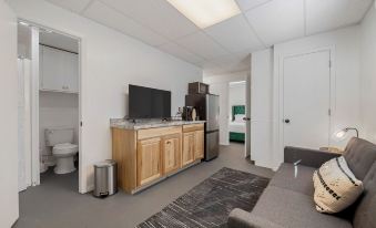 The living/kitchen: A couch, a 46 in smart TV to allow you to log into your favorite streaming apps, a microwave and a refrigerator/freezer and a Kuerig for your cup of morning joe.