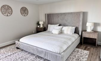Our spacious home has 4 bedrooms, 4 full bathrooms, comfortably sleep 12+1. All the bedrooms have their own separate bathrooms. 1st floor bedroom has king bed, 2nd floor master has queen bed+ sleeping futon ( more for kids under 15), 3rd bedroom has king bed and queen bed in the loft (same bedroom). 4th bedroom in the basement has 2 queen beds and a nice sitting area with TV.