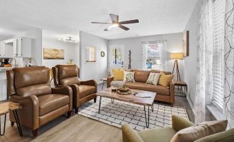 🛏 Main Bedroom: One King Bed (upgraded hybrid memory foam and cooling gel mattress, purchased new in June 2022) with bench for your suitcases. 43” Samsung Smart TV, lounge chair, speed-adjustable ceiling fan, triple-layer blackout curtains, and private main bathroom with a walk in shower. Full length mirror.