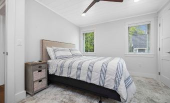 The cottage has three bedrooms. The master bedroom has a queen bed and private bathroom. Bedroom 2 has a queen bed. Bedroom 3 has a twin-sized bunk bed. Bedroom 2 and 3 share the hallway bathroom.