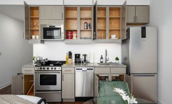 Our goal is to provide a socially and environmentally conscious living environment, along with top-notch customer service and unparalleled amenities that are unmatched elsewhere. The living space features high ceilings for a luxurious feel that blends with the kitchen, creating a modern and sleek living experience.