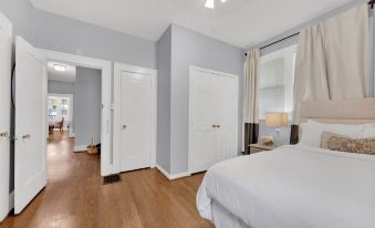 A Southern styled vintage house, authentically from the 40's that has been renovated to have both a mix of today's modern life with a vintage layout and charms. Newly and fully renovated, a great high 9 ft.+ ceiling three bedrooms, two full bathroom historical house with large front covered porch furnished with rocking chairs, bench, dining table with chairs, and lots outdoor sitting area. It has two cars garage at alley with fenced back yard for easy access to the house without walking on the stairs at front. Large living room with wood burning fireplace, beautiful formal dining room and fully equipped large kitchen and bath. Cleaning hardwood floors throughout. It had two queen bedrooms share full bathroom in the hall, master bedroom has King bed with attached private bathroom, lots spacious closet space in each bedroom. Bed and bath linens provided, smart TV, wifi, etc.This is a very nice, clean, and fully equipped-furnished house. A chance for at-home feel for the price of a hotel.
