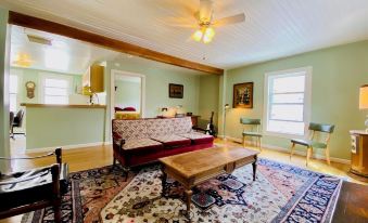 This is a full upstairs apartment, and there are no shared spaces. There is a mini-split AC unit in the hallway, and additional window AC units in the front bedroom and kitchen. The mini-split also heats the apartment, and we have extra space heaters in both bedrooms in case it gets chilly. There is a bar with live music located downstairs, and it closes at 10pm on weekdays and midnight on weekends. Please be aware that noise may be a problem if you go to sleep early.