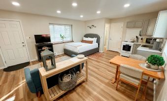 If you'd like a little more space, this attached studio can be rented simultaneously with the front cabin, which is attached to the studio via communicating doors. Inquire with us for further information.About pets:Pets allowed: dogs less than 50 lbs per pet (limit one pet total).About checkOut:Check out before 10:00 AM.About children:Children allowed: ages 0-17.About checkIn:Check in after 4:00 PM.About smoking:Smoking is not permitted.About minBookingAge:Minimum age to rent: 21.About events:No events allowed.