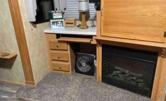 Recently we have put down new carpet and laminate flooring. The kitchen is stocked basic food items. Next comes the dining & living area. In the kitchen, is the refrigerator, propane stove, sink & table with 4 chairs. There is a bar with 2 stools. In the living room, there is an electric fireplace, a dedicated workspace, new sleeper sofa with upgraded mattress. There is also a recliner. You will also have storage space in the fifth wheel for your luggage.