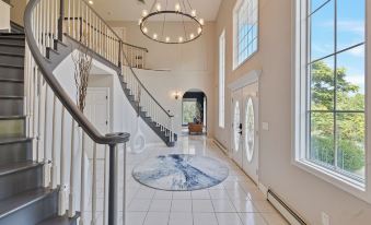 High on the hill at the end of a private drive, a grand Georgian Colonial home awaits. Beyond towering columns, the elegance of the entryway continues in an impressive foyer with a semi-circular staircase curving up to the second floor.