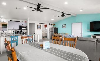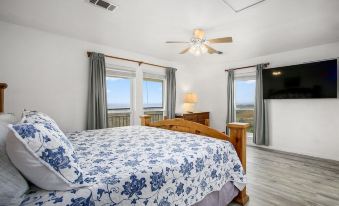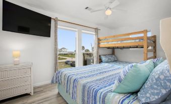 The master suite has a king-sized bed and a rollaway twin bed stored in the walk-in closet. The master bedroom has a wall of windows with gorgeous ocean view. Guest bedroom#1 has a low-profile twin-over-twin bunk bed, perfect for small kids and adventurous adults alike. Guest bedroom#2 has a queen bed and a full-over-twin bunk bed, sleeping 5. Guest bedroom#3 has a queen bed and a full-over-full bunk bed, sleeping 6. All bedrooms have windows with beach/ocean view and ceiling fans.