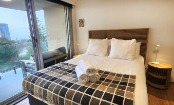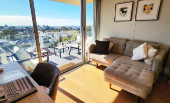 Features floorboards throughout and comfortable furnishings that create a welcoming, home-like atmosphere. The spacious main bedroom is a serene retreat, featuring a queen bed, built-in wardrobes, a ceiling fan, and a private balcony with views toward Bondi Junction. Its ensuite bathroom includes a shower for added convenience.