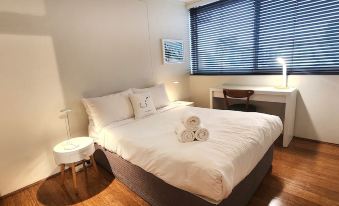 The second bedroom is equipped with a double bed, built-in wardrobes, a ceiling fan, and a desk, perfect for those needing a workspace. The third bedroom offers flexibility with two king single beds that can be converted into a king bed, along with built-in wardrobes, catering to various guest arrangements.