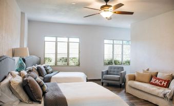 Only a 10 minute drive from Aguadilla (BQN) airport this elegant “Santorini” style ocean front Villa offers front row seats to Puerto Rico’s best sunsets. Flamboyan features high ceilings, modern décor, spacious comfortable spaces filled with natural light. The Villa combines all the necessary elements for your ideal Caribbean escape: ocean-view decks, a refreshing infinity pool, 5 spacious bedrooms each one with their own bathroom, an even secret stairs to the ocean! Start off the day by sunbathing under the morning sun, cool off from the intense mid-day heat by snorkeling or swimming in our turquoise crystal waters, take a walk down Playuela valley, sign up for surfing lessons, or adventure out to sea to catch some fish! We invite you to come experience Puerto Rico’s laid back west coast in style!