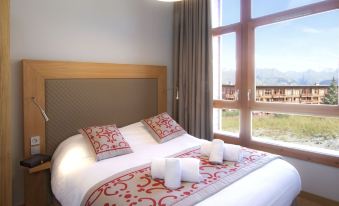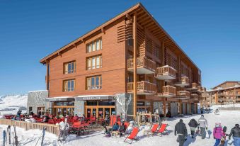 Rustic, comfortable residence "Résidence Prestige Odalys Edenarc". Above Village du Chantel 2 km from the centre of Les Arcs 1800, in a sunny, elevated position, directly by the skiing area, on the golf course. For shared use: indoor pool heated (8 x 12 m, seasonal availability: 01.Jul. - 31.Aug.). In the complex: reception, restaurant, lounge, sauna, fitness room, massage (extra). Steam room, hot tub, relaxation room, lift, storage room for skis. Bread roll service, breakfast and half board possible (extra). Communal covered parking (extra). Parking space or garage only for small to medium-sized cars. Dimension: height 210 cm. Shop, restaurant 700 m, bar, bus stop 50 m. Golf course (18 hole) 600 m, tennis, mountain railway, ski lift, slopes 100 m. Well-known ski regions can easily be reached: Paradiski. Please note: In case of good snow conditions, the house is accessible on skis. The photograph shows a typical example. The photo is just an example. The holiday properties may differ in living space, floorplan, equipment and furnishing. "Résidence Odalys Collection Edenarc", 2-room apartment 36 to 43 m2. Tasteful furnishings: living/sleeping room with 1 double sofabed, dining table and satellite TV. 1 room with 2 sleeping facilities. Small, open kitchen (dishwasher, 4 ceramic glass hob hotplates, toaster, kettle, microwave, electric coffee machine). Bath/WC. Underfloor heating. Balcony or terrace. Balcony furniture. Beautiful view of the mountains. Facilities: children's high chair, baby cot. Internet (WiFi, free). Please note: maximum 1 pet/ dog allowed. Smoke alarm, fire extinguisher.
