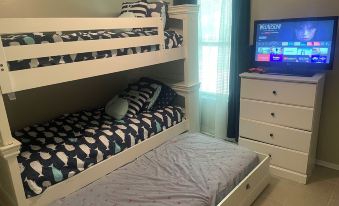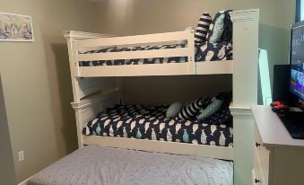2 bedrooms: 1 bunk bed 1 single bed and 1 queen bed