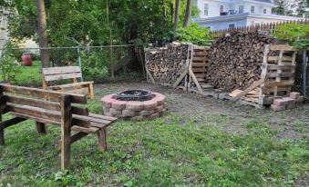 The exterior of the home has a partially fenced in yard. There are benches to sit and enjoy the fire pit. Firewood is provided.