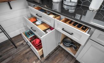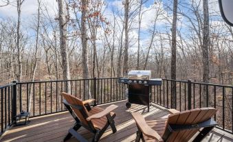 While outside, you will love the stunning view of nature from a ridge surrounded by mature trees while soaking in the hot tub. Use the charcoal grill for your BBQing or enjoy s’mores at the fire pit with our complimentary firewood on-site.  S’more kits are provided and are a must for every campfire.