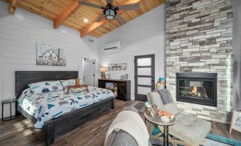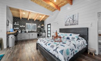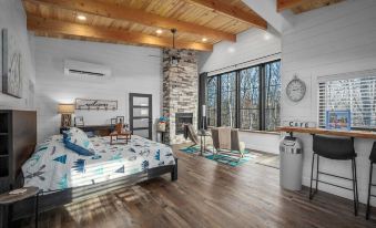 Upon entry into our rustic treehouse, you will enjoy natural sunlight that peaks through the large picture window.  The kitchen, living and bedroom areas are all open spaces that flow together seamlessly with plenty of places to sit and relax. The kitchen is stocked for your cooking needs in addition to a Keurig for your morning coffee, tea or hot chocolate.  Enjoy puzzles, indoor and outdoor games or books for relaxing days. On cold evenings, grab a blanket and snuggle in front of a stone fireplace. The laundry room is available for your use.