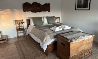 The bedroom has a kingsize solid wood bed, hotel quality Egyptian cotton sheets and towels, two vintage Elm chairs for bedside tables, a large antique pine trunk, chest of drawers and a window seat with cushions and blankets.