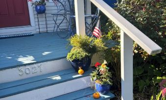 Front porch overlooks vintage garden, flower boxes and provides a spot to enjoy an early morning cup of hot coffee.