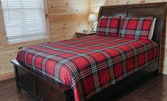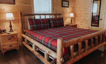 The master bedroom offers a beautiful king log bed and an en-suite with a full bath. Through the back patio doors you have a private entrance to the back deck and hot tub. The master also offers a flat screen TV with satellite.
