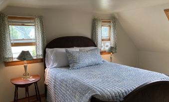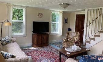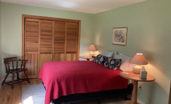 Relaxed and family friendly, our farmhouse, cottage-style home is mostly furnished with vintage pieces from the mid -1900’s for those who enjoy a quaint and cozy, retro feel. It features a large sun porch which opens into a well equipped, eat-in kitchen. The bright, comfortable living room overlooks spacious lawns, and its mature trees and shrubs provide a lot of privacy in this residential part of town. The first floor master bedroom has a queen-size bed and is adjacent to the first floor bathroom which is equipped with washer, dryer, and full-sized tub/shower. The dining room has sliding doors opening onto the front deck. On the second floor, you’ll find 2 bedrooms, one with twin beds and one with a full-size bed. The second floor bathroom has a tub.