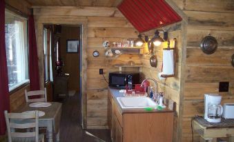 The cabin is fully self contained. It has its own kitchen, bath with shower (no tub), and a small living/dining area. One bedroom with a king size bed.