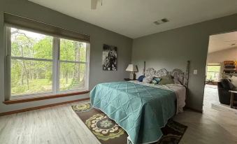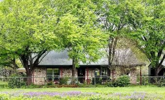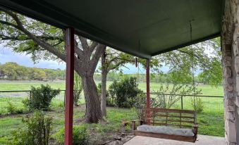 Come stay in the country in our 2 bedroom, 1 1/2 bath home nestled in the beautiful Hill Country of Texas. The open plan hosts a huge comfy sofa and a 70” TV with internet. King and queen beds , so comfy, you don’t want to get out of bed. We offer a great workspace area where you can enjoy the beautiful scenery while you work. Enjoy the fully stocked kitchen for cooking in the open floor plan. Sit at the kitchen bar and enjoy the “HEART OF THE HOME” . Soak up the quiet, serenity and comfort of the 180 views of outside from the kitchen island. If you love the outdoors, BBQ on the pit and enjoy all the nature the ranch offers. Dip your toes in the spring fed creek behind the house or watch the horses grazing in the front pasture. The back porch overlooks the spring feed creek where you can enjoy a gorgeous sunset and a glass of wine while lounging or just sitting on outdoor furniture enjoying a fire in the firepit. You can sit and read a book or just sit and enjoy a serene quiet place to unwind . Enjoy your morning coffee watching the wildlife from the front porch swing or rockers. The dark skies at night host more stars than you can imagine. stargazing with unparalleled views! You’ll be greeted at the entrance with a coded gate. As you meander down the long driveway you will be amazed at the home nested under huge oak trees. Truly a special place.