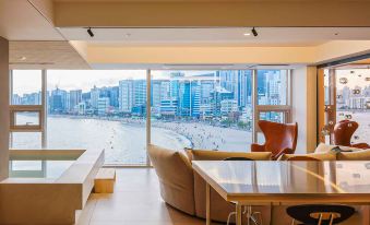 The room is clean, modern, and bright, with a big bathtub facing the sea — super romantic and relaxing. The ocean view from the balcony is stunning, especially at night with the Gwangandaegyo Bridge lights.