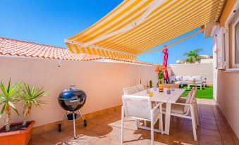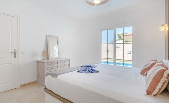 Large, child friendly villa "Sueño Azul". In the resort Callao Salvaje, in a quiet, sunny position residential area (villas), traffic calmed area, 100 m from the sea, 600 m from the beach, in a cul-de-sac. Private: swimming pool angular, heated (depth 60 - 160 cm, seasonal availability: 01.Jan. - 31.Dec.) with internal staircase and shutter cover. Outdoor shower, pool maintenance by the owner/gardener. Supermarket 450 m, shopping centre 4 km, restaurant, café 50 m, bus stop "Callao Salvaje" 600 m, sandy beach "Playa de Ajabo" 650 m. Golf course (18 hole) 7 km. Nearby attractions: Siam Park 13 km, Teide 59 km, Masca 30 km, Aeropuerto Sur 27 km, Playa Las Americas 15 km. The owner does not accept any youth groups. Neighbourhood highly sensitive to noise. Quietness and good behaviour expected. "Mila Moon", 4-room villa 225 m2. Object suitable for 6 adults. Spacious and bright, comfortable and modern furnishings: living room with dining table, digital TV, international TV channels, flat screen and fan. Exit to the swimming pool. 1 room with 1 french bed (180 cm, length 200 cm), bath/bidet/WC and fan. Exit to the swimming pool. 1 room with 1 french bed (160 cm, length 200 cm), fan. 1 room with 2 beds (90 cm, length 200 cm), fan. Open kitchen (oven, dishwasher, 4 ceramic glass hob hotplates, toaster, kettle, microwave, freezer, electric coffee machine). Shower/WC. Boiler (80 litres). No heating option. Large terrace, lawn. Terrace furniture, barbecue, deck chairs (4), sitting area. Very beautiful panoramic view of the sea, the swimming pool and the countryside. Facilities: washing machine, mosquito net, children's high chair, baby cot for up to 2 year olds, hair dryer. Internet (WiFi, free). Please note: suitable for families. Non-smokers only. Smart TV. VV-38-4-0110592