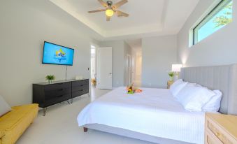 The master bedroom features a luxurious king bed with an attached bathroom, complete with a tub and walk-in shower for privacy and convenience. The guest bedrooms are perfect for families, with one featuring a bunk bed that accommodates up to four children and the other offering a queen bed. A well-appointed bathroom with a walk-in shower is shared among the guest bedrooms, ensuring comfort for all guests.