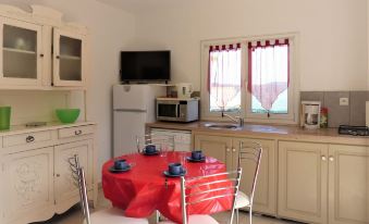 The 2 fenced terraces outside are real spaces of around 100m². They are equipped with comfortable garden furniture for your relaxation and your meals. The view of the maquis is breathtaking and calm guaranteed. Sheets, pillowcases, sheets and towels not provided (we can arrange to reserve them for you against reimbursement, from the supplier).
